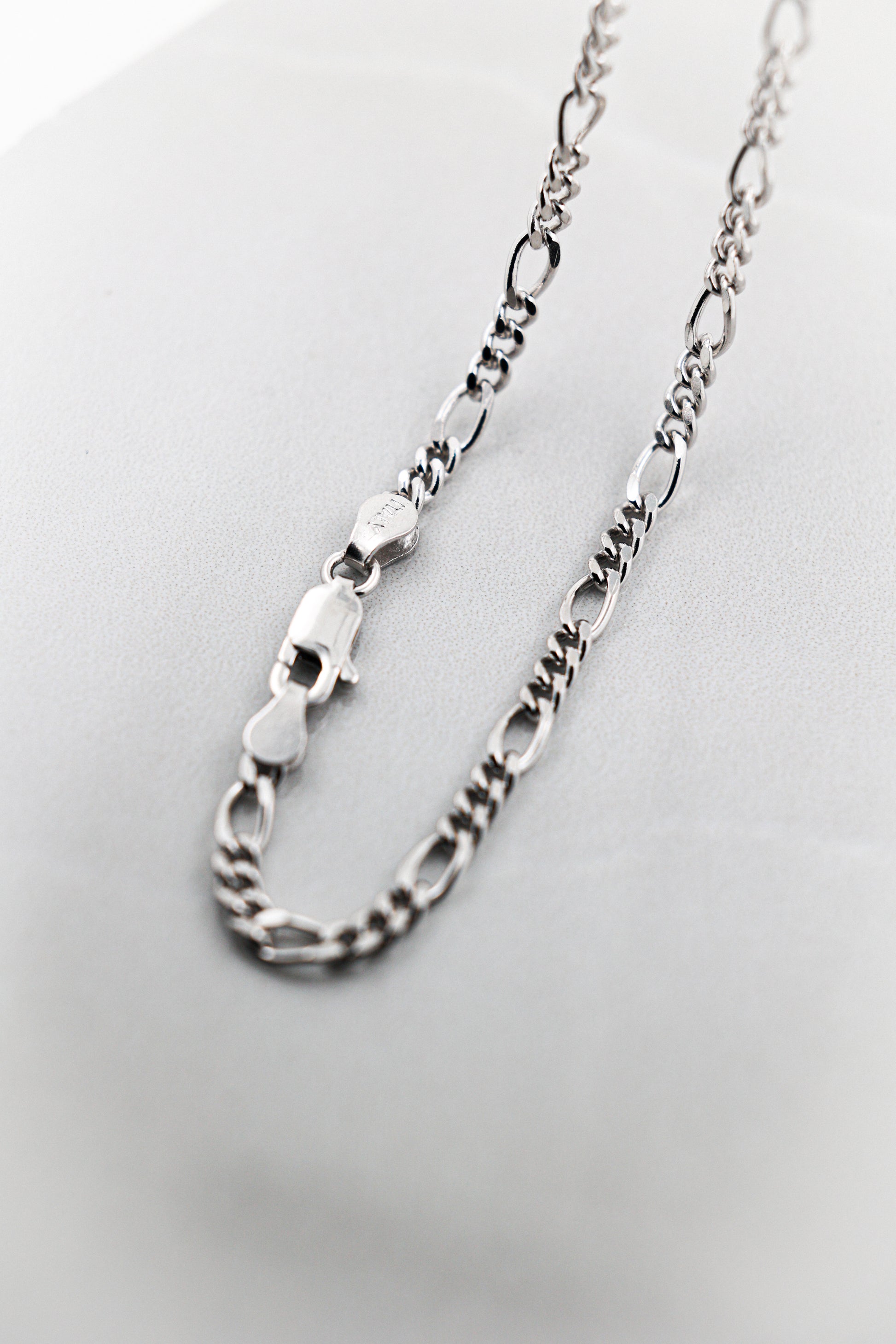 Crafted exclusively from noble metals, our 3mm Figaro link reflects both elegance and resilience. Beginning with a solid foundation of 925 sterling silver, it is enriched with a radiant rhodium finish and sealed with a cutting-edge antioxidant coating. This careful blend enhances its brilliance, preserves its color, and reinforces its durability — making it an ideal piece for everyday sophistication.