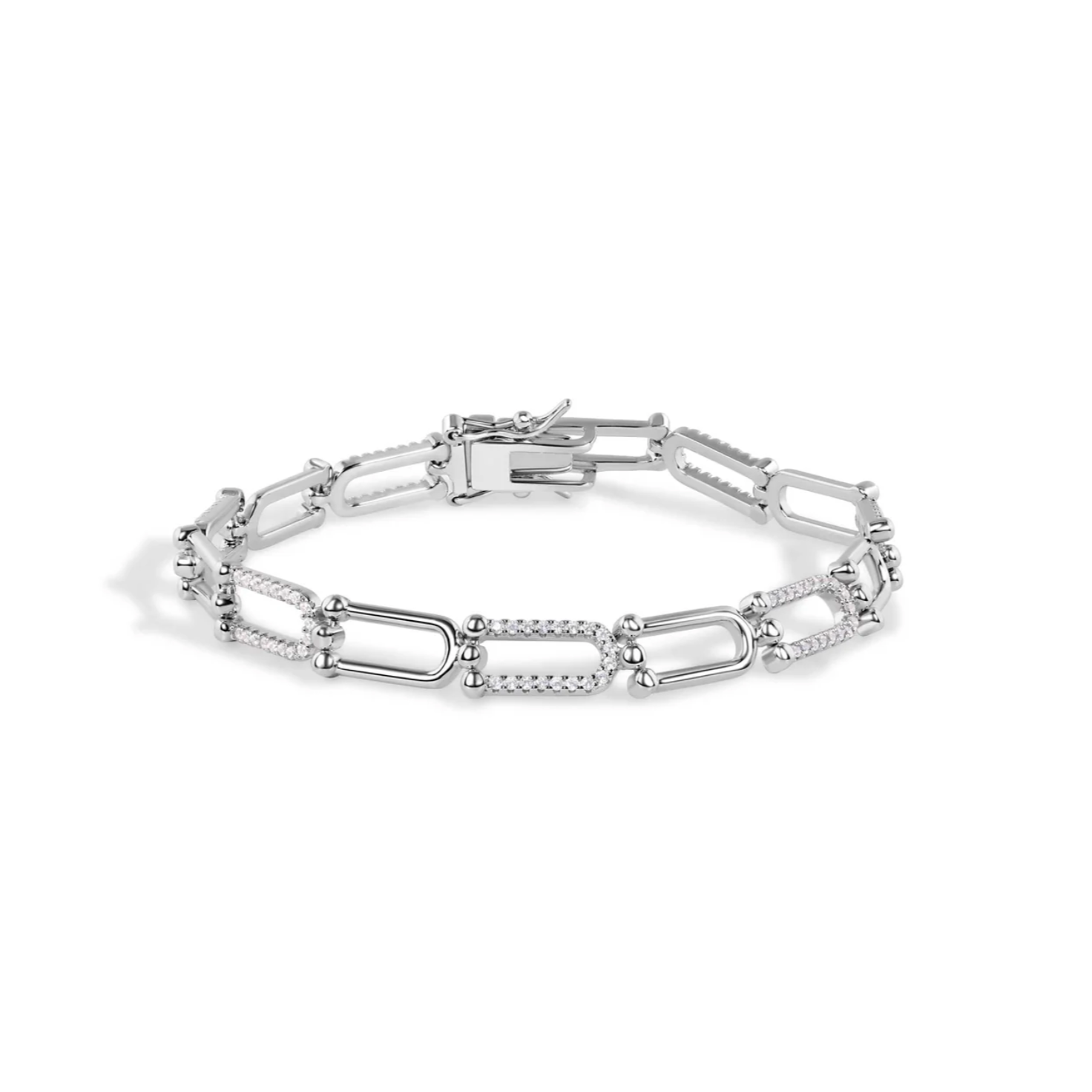 Crafted in 925 sterling silver with rhodium plating, this micro-pavé bracelet blends modern geometry with timeless shine. Each handset with sparkling CZ stones, create a sleek design that catches the light from every angle.